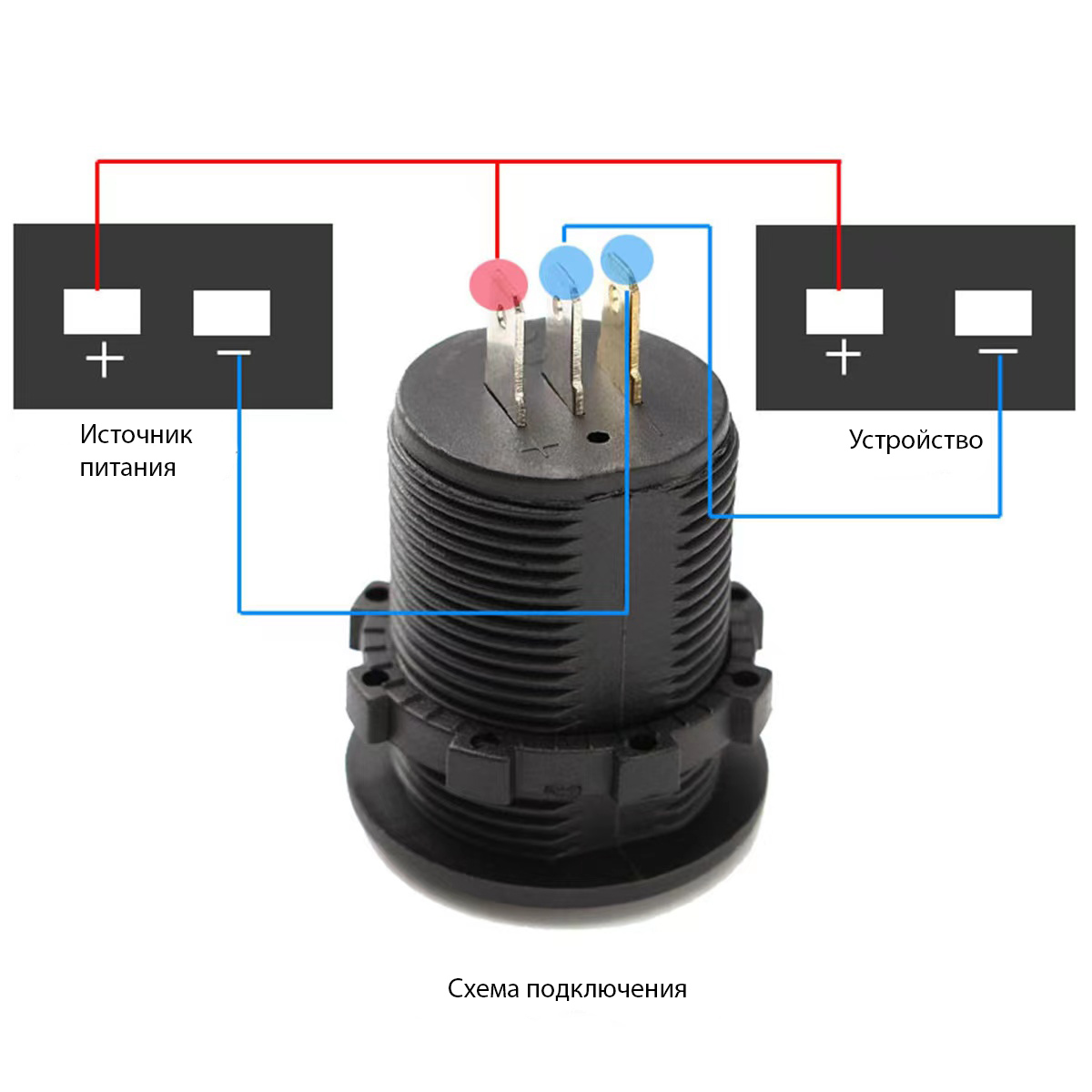 Устройство крепится путем фиксации в отверстии на панели с помощью гайки (в комплекте). Подключение контактов осуществляется плоской клеммой, либо с помощью пайки. Есть функция подсветки