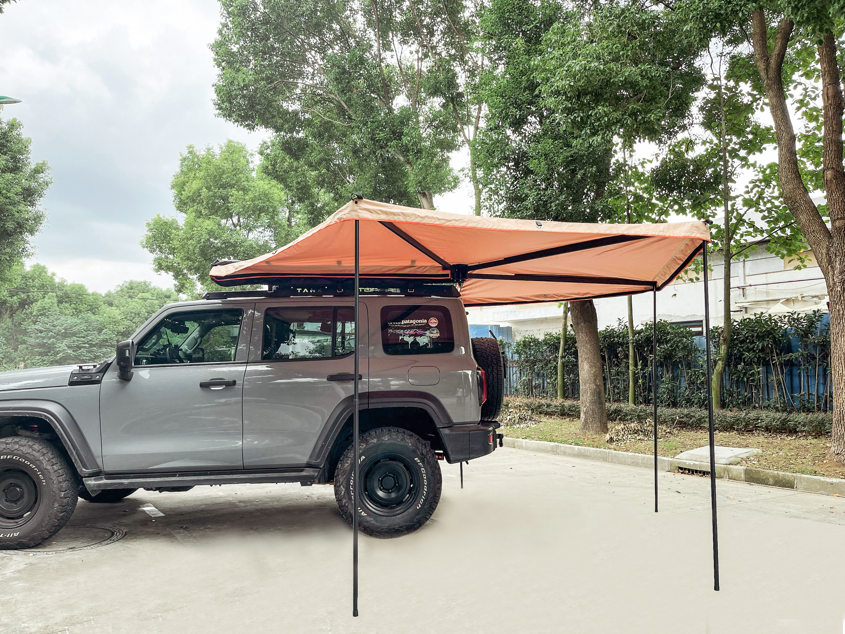Размер тента в рабочем состоянии: 2 метра по стороне, которая крепится к автомобилю и 2 метра по вылету. Такой тент позволяет с комфортом разместить рядом с автомобилем 4-5 человек.
