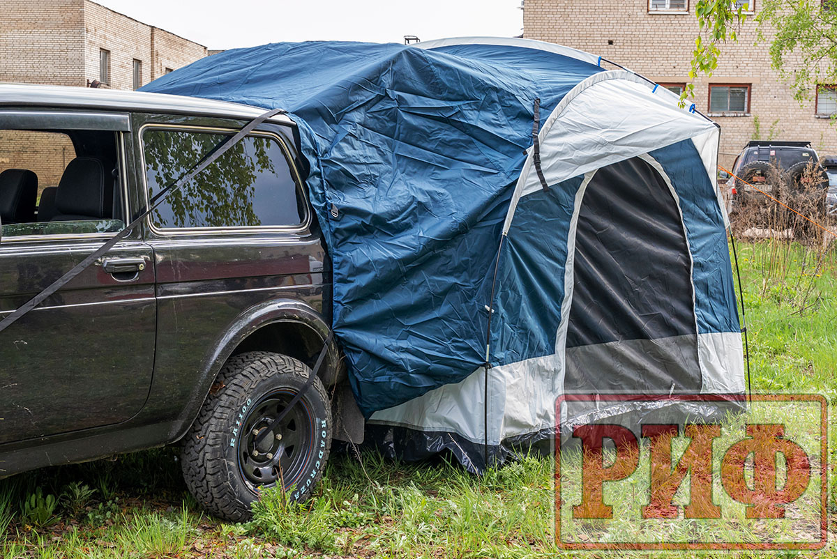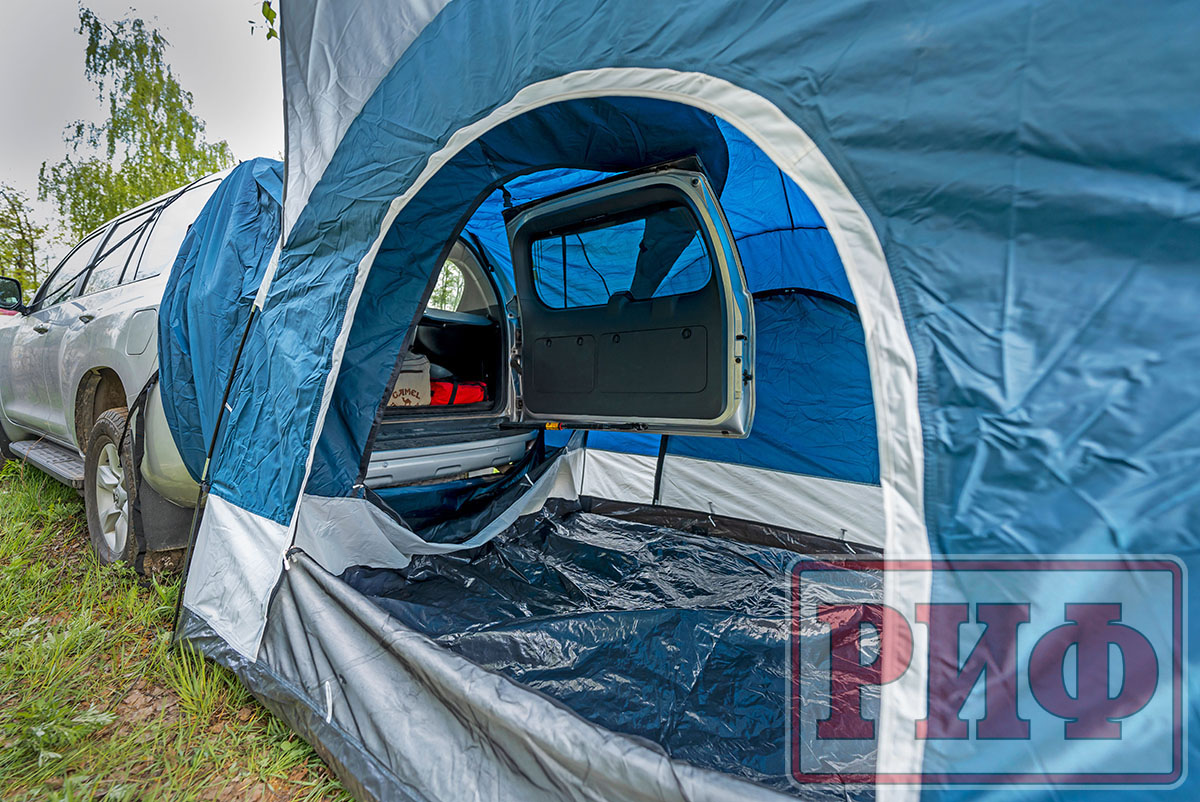 Тент-тамбур можно использовать и как место для столовой, и как дополнительный объем под спальные места.