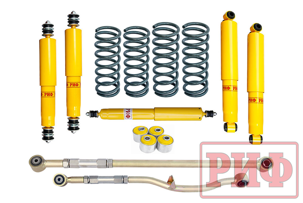 Все компоненты лифт-комплектов РИФ разработаны специально для эксплуатации внедорожника в тяжелых условиях на различных дорожных покрытиях. Рессоры, амортизаторы с технологией Foam Cell и пружины РИФ не только компенсируют вес установленного на внедорожнике дополнительного оборудования (бамперов, порогов, дополнительных топливных баков, лебедок и прочего), но также существенно повышают грузоподъемность автомобиля. Удлиненные стремянки и серьги РИФ произведены из высококачественных материалов и имеют увеличенный запас прочности. Рессорные втулки РИФ изготовлены из полиуретана обладает высокой упругостью, износостойкостью и термоустойчивостью к высоким или низким температурам.