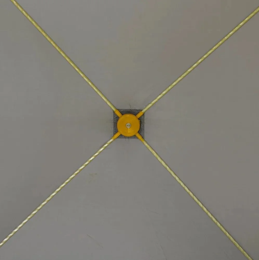Установить палатку можно в течение одной минуты даже одному человеку. Благодаря специальной системе крепления дуг, «хабы» палатки очень быстро переводятся из транспортного положения в рабочее состояние.